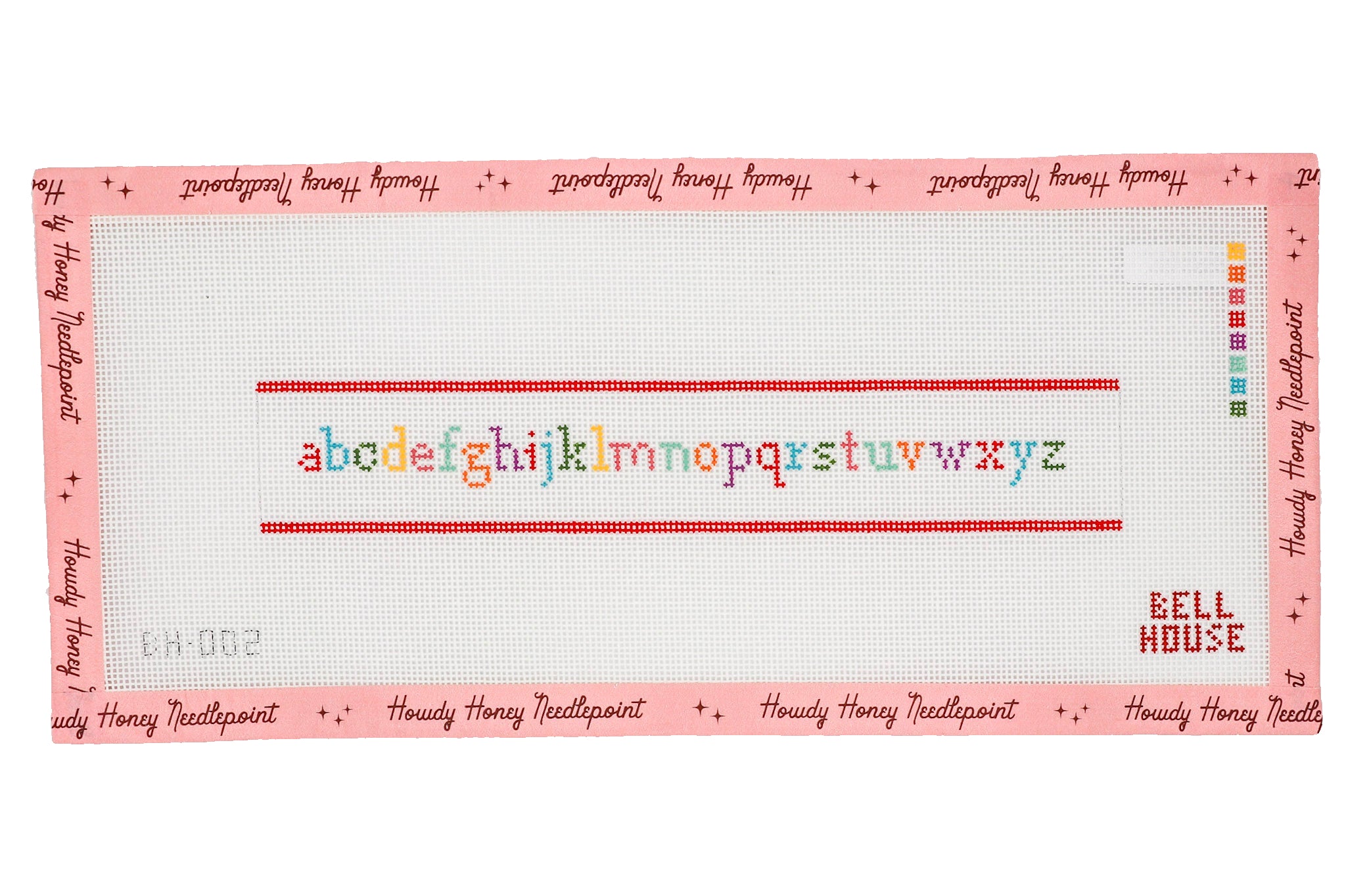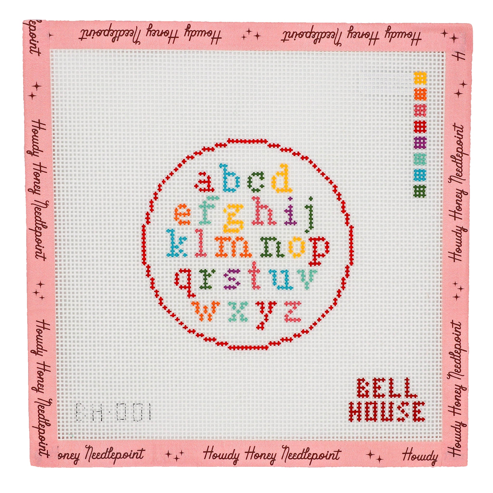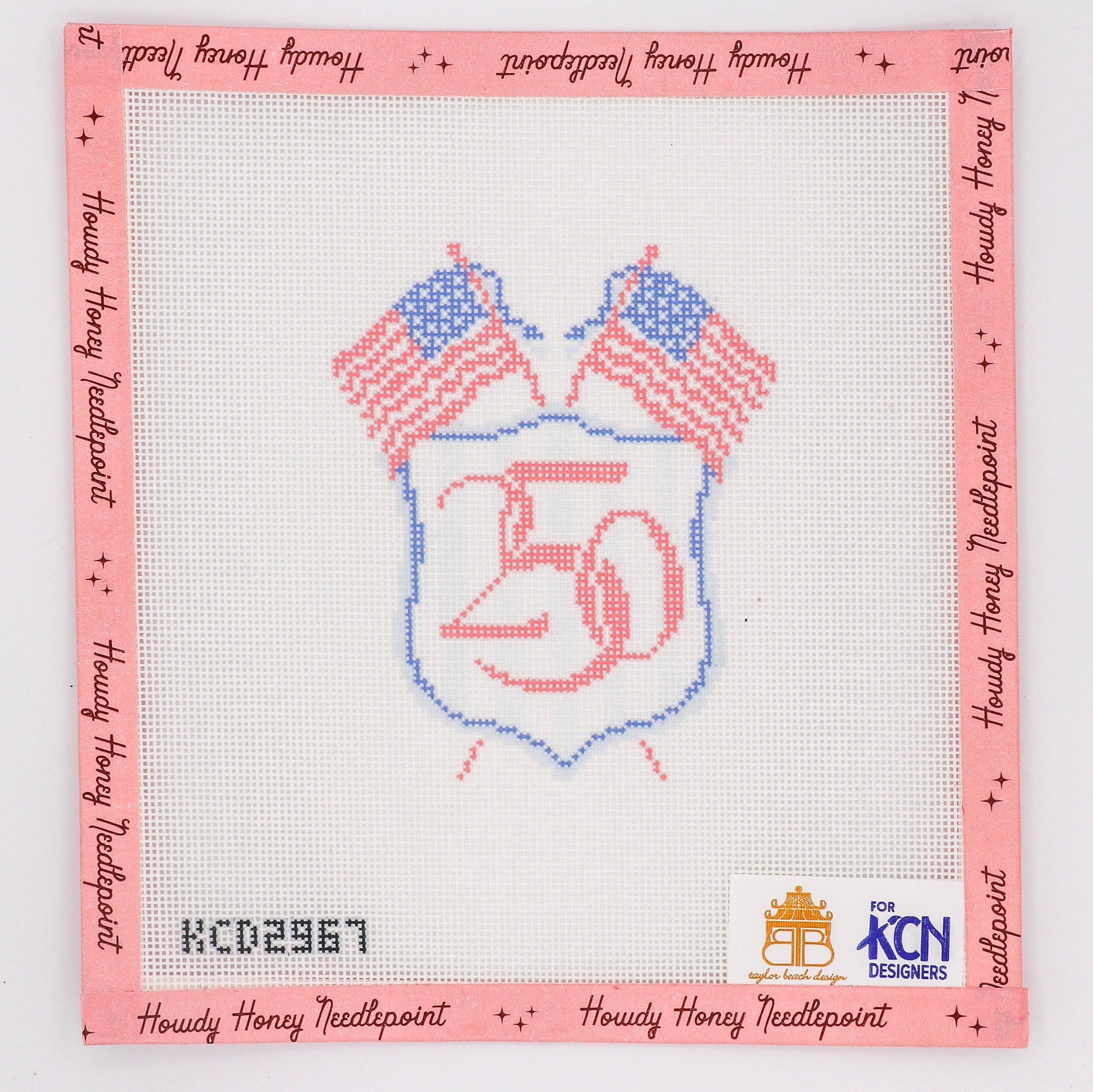 Cross-stitched heart design with 'The Heights' text on a pink border with 'Howdy Honey Needlepoint' branding.