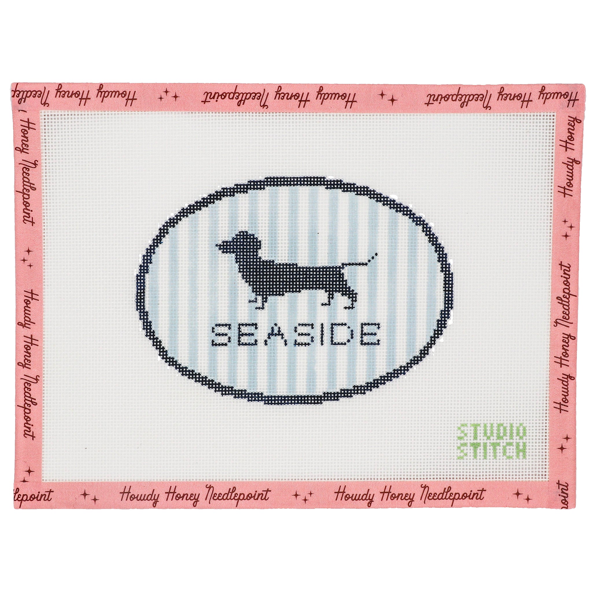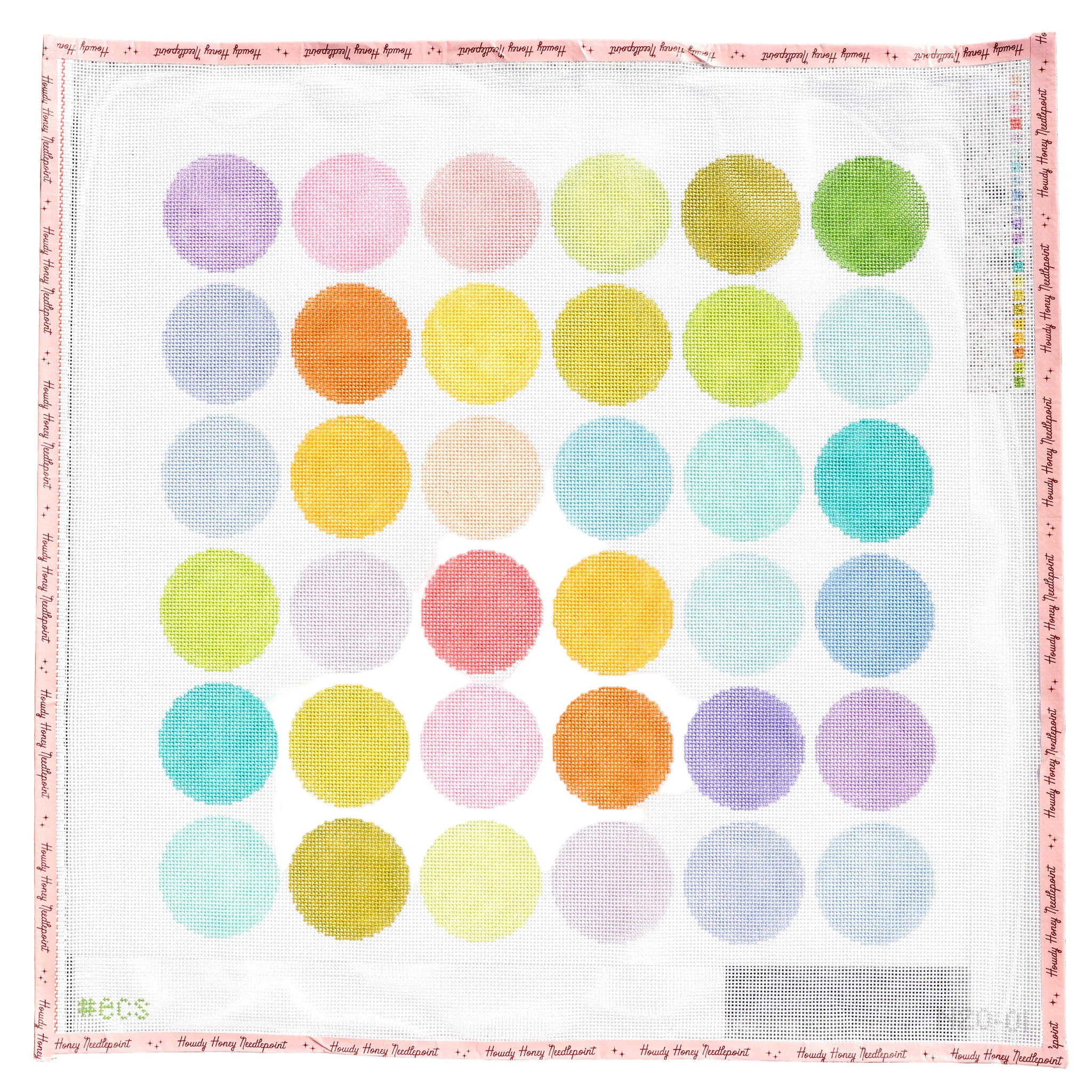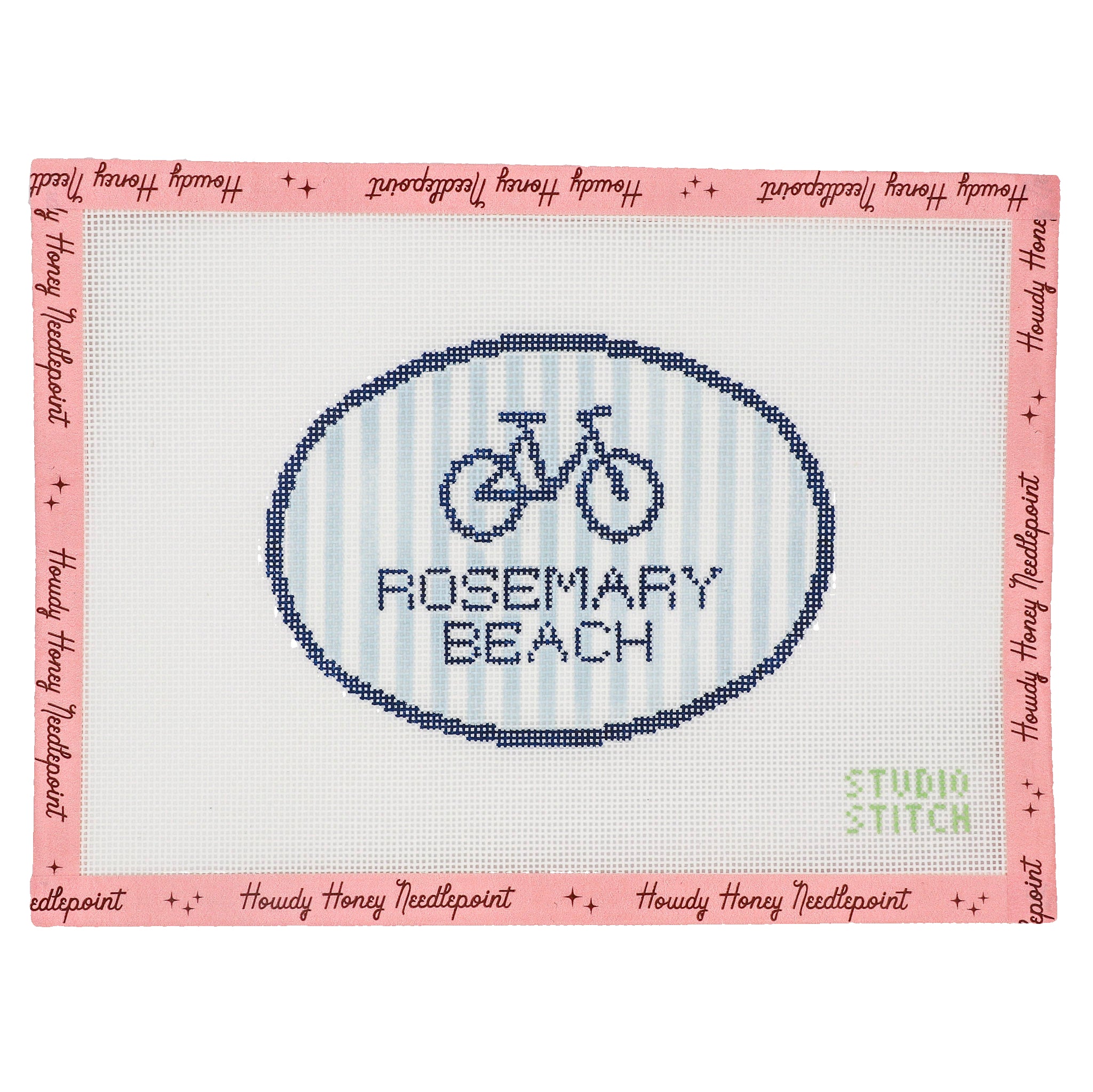 Cross-stitched heart design with 'The Heights' text on a pink border with 'Howdy Honey Needlepoint' branding.